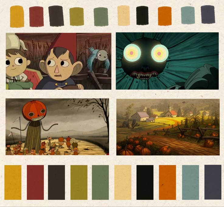 Pessoalmente, creio que o coração da minissérie está na animação e sua paleta de cores, que usa de tons bem dessaturados. E tem um motivo pra isso: as cores aqui também estão passando uma mensagem, que é de estranheza. Normalmente o traço usado pela estética Cartoon Network vem acompanhado de tons mais saturados e coloridos, mas aqui não. Á primeira impressão parece que esses tons não conversam com a estética do traço de Over the Garden Wall, só que não demora muito para você entender que essas cores tem a missão de te falar mais sobre o tom da história do que qualquer outra coisa, já que na real a história gira em torno de assuntos como medo, morte, descaso, traumas, arrependimentos. E tudo em uma subjetividade incrível, as cores acabam também tendo um papel narrativo muito importante, além de ajudar nessa ambientação mais antiga que a série carrega.