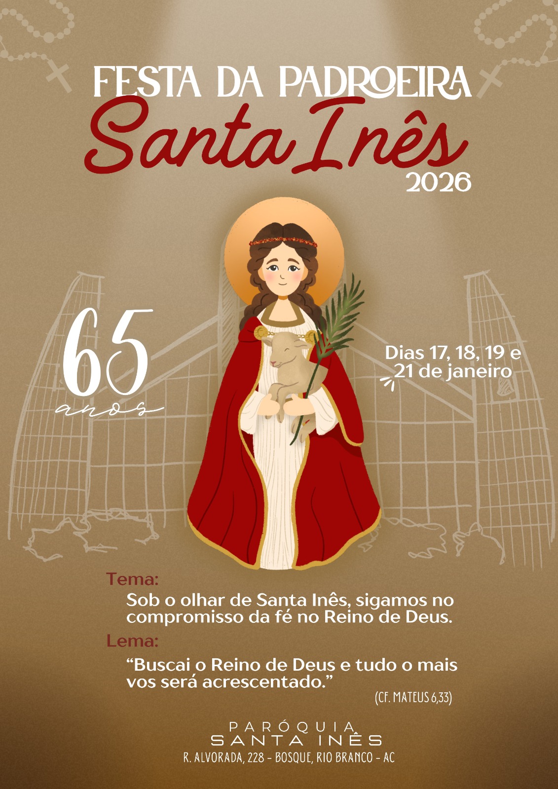 Após celebrar seu jubileu de 65 anos em 2025, a Paróquia Santa Inês, pertencente à Diocese de Rio Branco, inicia o calendário de 2026 com a tradicional Festa da Padroeira Santa Inês. Com o tema “Sob o olhar de Santa Inês, sigamos no compromisso da fé no Reino de Deus”, a programação oficial terá início no próximo dia 10 de janeiro e contará com celebrações religiosas, momentos culturais e o aguardado bingo eletrônico.