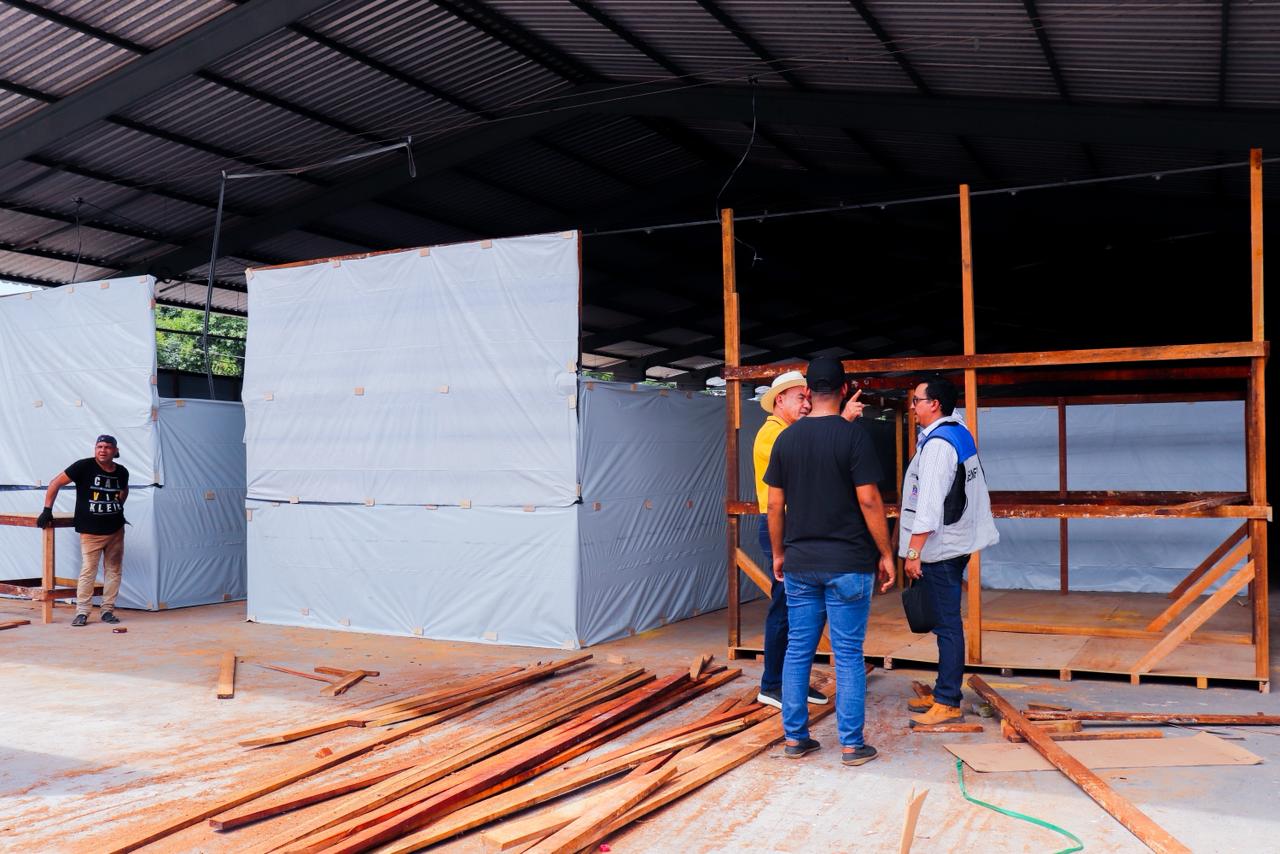 Na manhã desta segunda-feira (29), o prefeito esteve no Parque de Exposições Wildy Viana para acompanhar a construção dos boxes que irão abrigar as famílias. (Foto: Vitória Souza/Secom)
