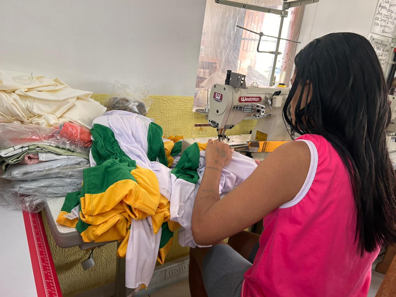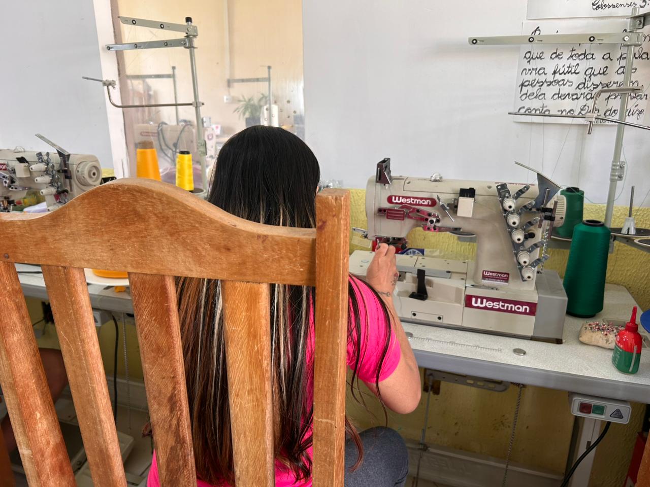 Para J.S.P., detenta há cinco anos, o barulho das máquinas traz alívio. “A minha rotina aqui é maravilhosa,” diz ela com a voz carregada de uma satisfação recém-descoberta. “Às vezes, a gente passa o dia todo aqui. Só volta para a cela para dormir. E para mim é ótimo. Porque além de adquirir conhecimento durante o dia todo, a gente fica trabalhando. A gente esquece um pouco a cadeia em si e fica focada aqui no trabalho”.