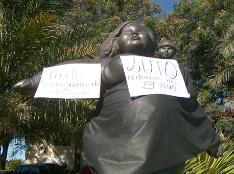 Manifestantes armaram uma tenda e fizeram cartazes e colocaram uma faixa preta na estátua da Maternidade Bárbara Heliodora representando luto. A escultura que recebeu o nome de “vida” na época da reinauguração da unidade, em 2010, tem sido destaque por outro motivo.