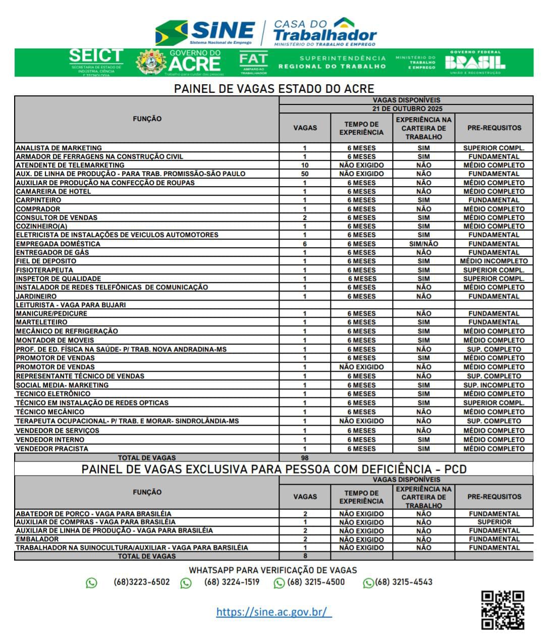 O Sistema Nacional de Emprego do Acre (Sine-AC) oferece 106 vagas de emprego para a população de Rio Branco nesta terça-feira (21). Destas vagas, 8 são destinadas exclusivamente às pessoas com deficiência.