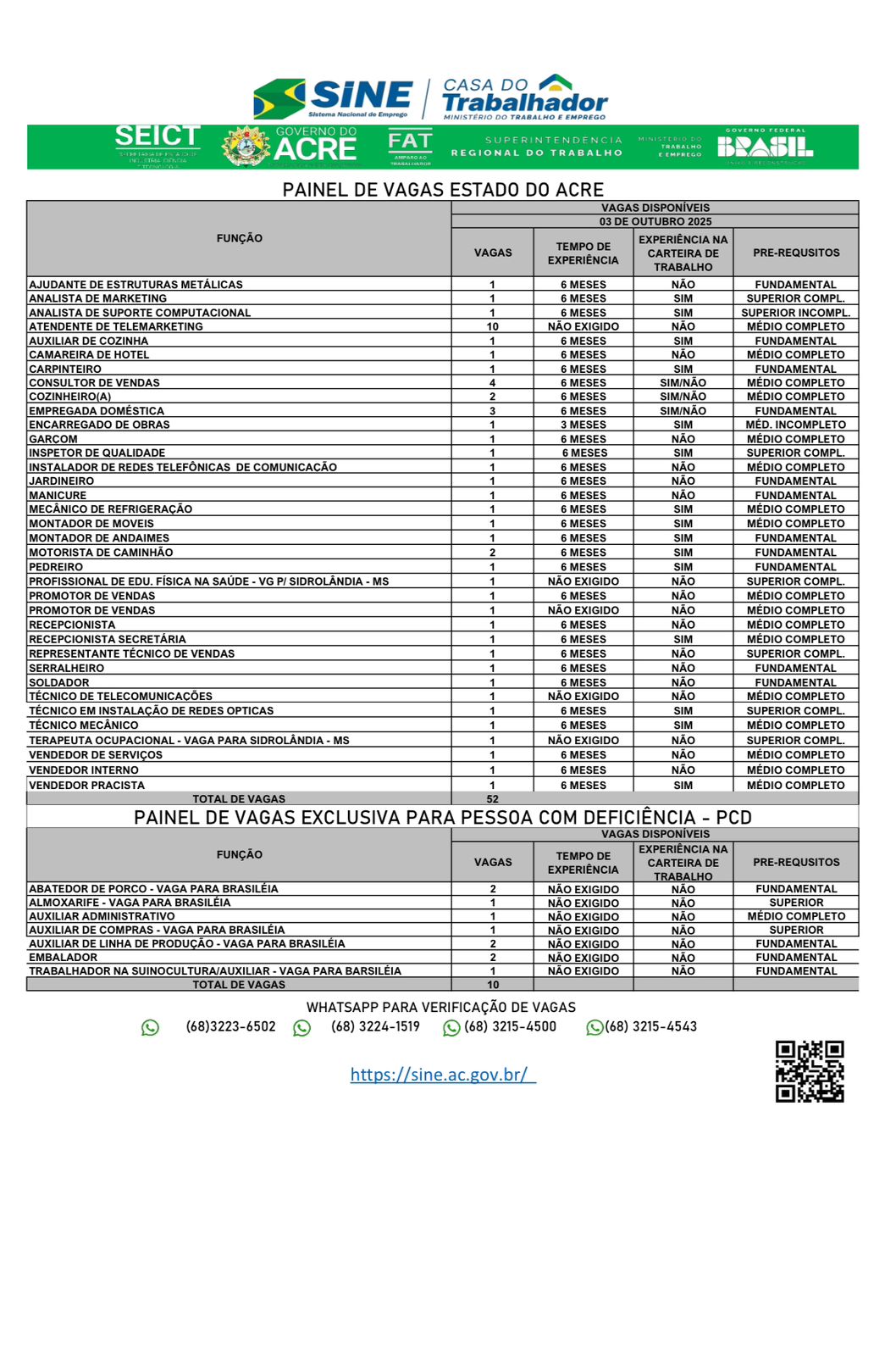 O Sistema Nacional de Emprego do Acre (Sine-AC) oferece 62 vagas de emprego para a população de Rio Branco nesta sexta-feira (3). Destas vagas, 10 são destinadas exclusivamente às pessoas com deficiência.