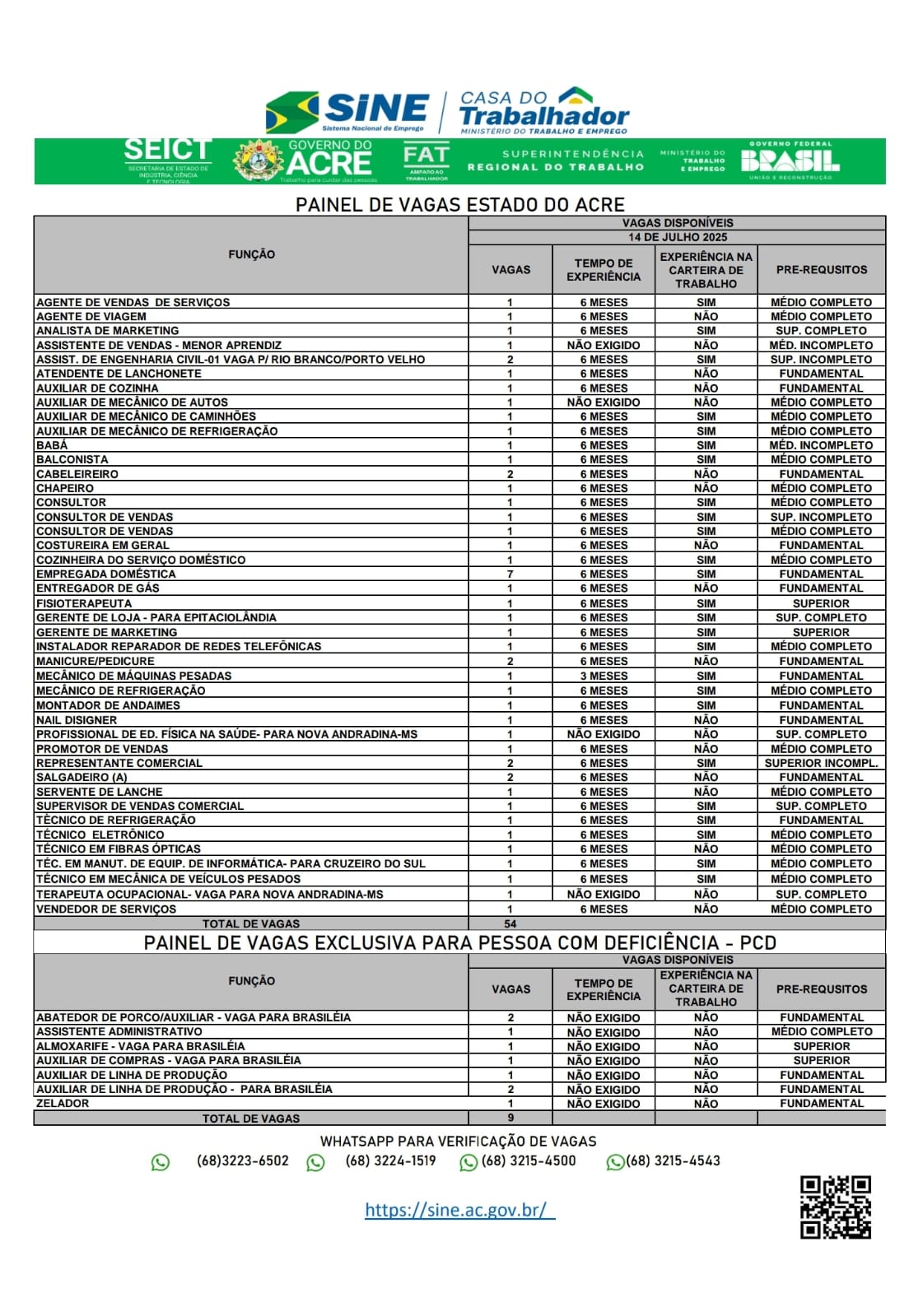 O Sistema Nacional de Emprego do Acre (Sine-AC) oferece 53 vagas de emprego para a população de Rio Branco nesta quinta-feira (26). Destas vagas, 9 são destinadas exclusivamente às pessoas com deficiência.