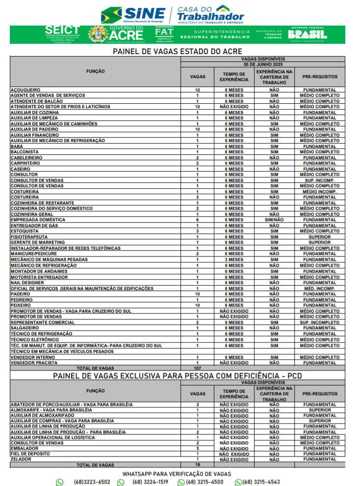 O Sistema Nacional de Emprego do Acre (Sine-AC) oferece 125 vagas de emprego para a população de Rio Branco nesta quinta-feira (05). Destas vagas, 18 são destinadas exclusivamente às pessoas com deficiência.