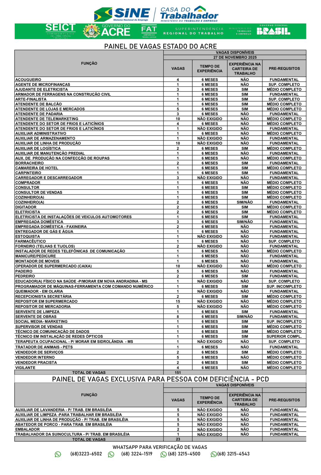 O Sistema Nacional de Emprego do Acre (Sine-AC) oferece 151 vagas de emprego para a população de Rio Branco nesta quinta-feira (30). Destas vagas, 23 são destinadas exclusivamente às pessoas com deficiência.