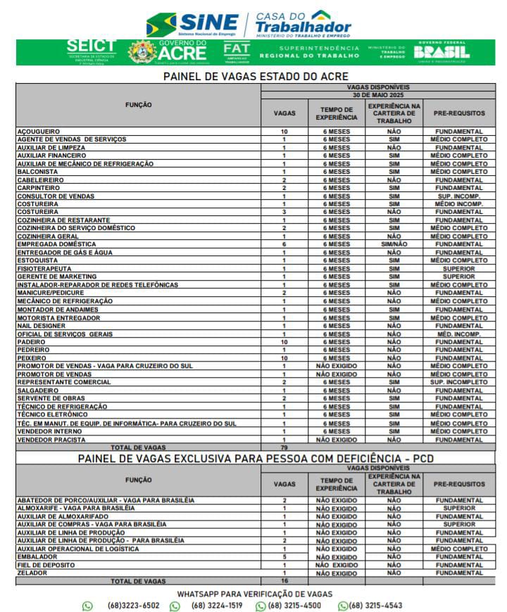O Sistema Nacional de Emprego do Acre (Sine-AC) oferece 95 vagas de emprego para a população de Rio Branco nesta sexta-feira (30). Destas vagas, 16 são destinadas exclusivamente às pessoas com deficiência.