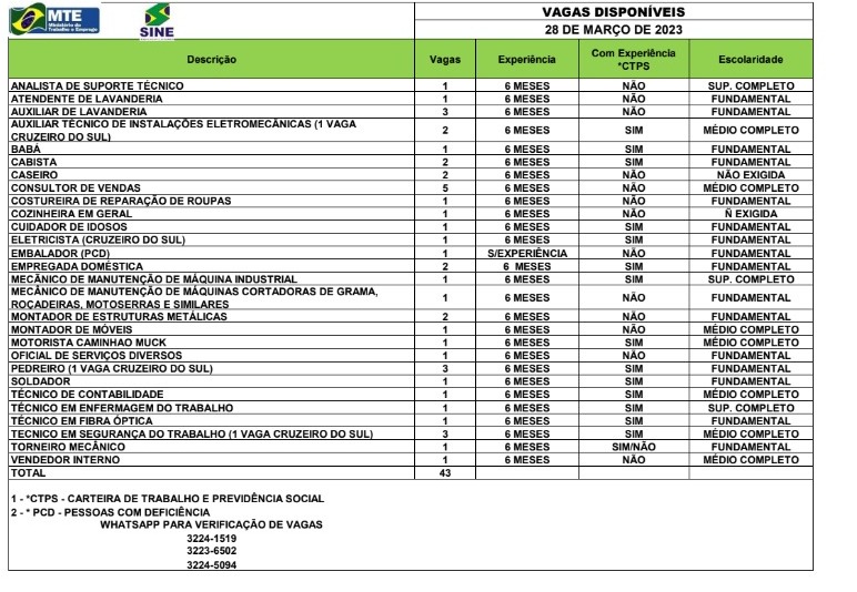 O Sistema Nacional de Emprego do Acre (Sine) disponibiliza 43 vagas para diversas áreas nesta terça-feira (28) em Rio Branco. Os interessados podem se dirigir até o Sine na Organização em Centros de Atendimento (OCA) e na sede do Sine.