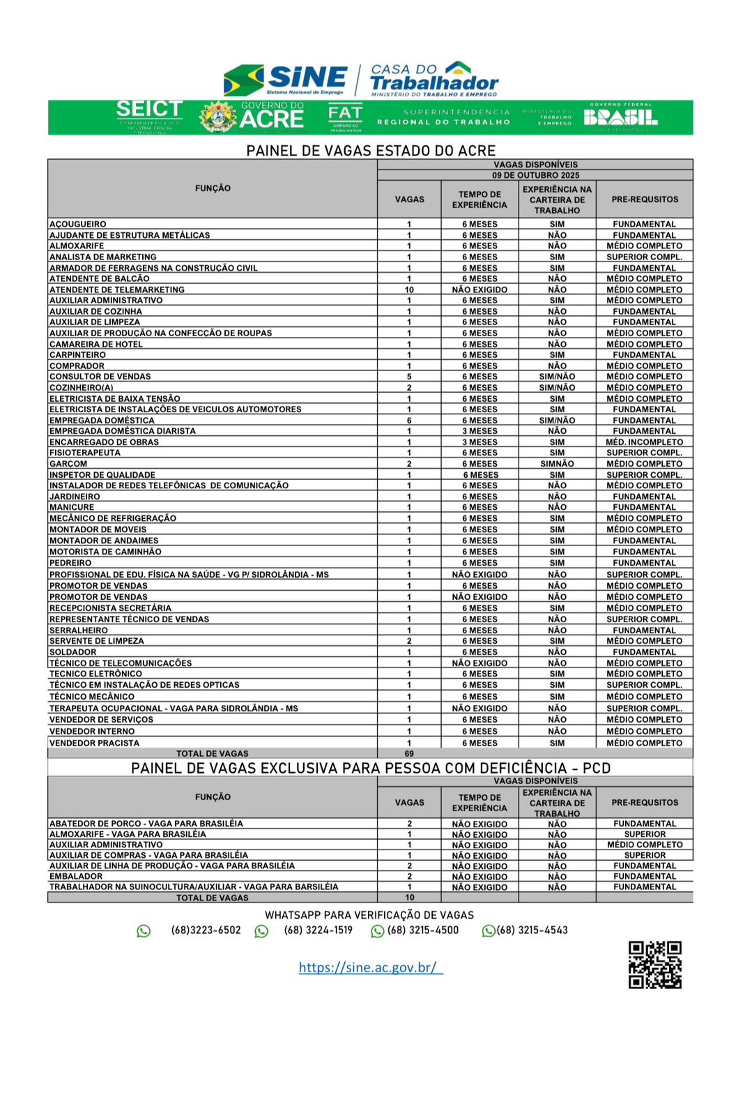 O Sistema Nacional de Emprego do Acre (Sine-AC) oferece 59 vagas de emprego para a população de Rio Branco nesta quinta-feira (9). Destas vagas, 11 são destinadas exclusivamente às pessoas com deficiência.