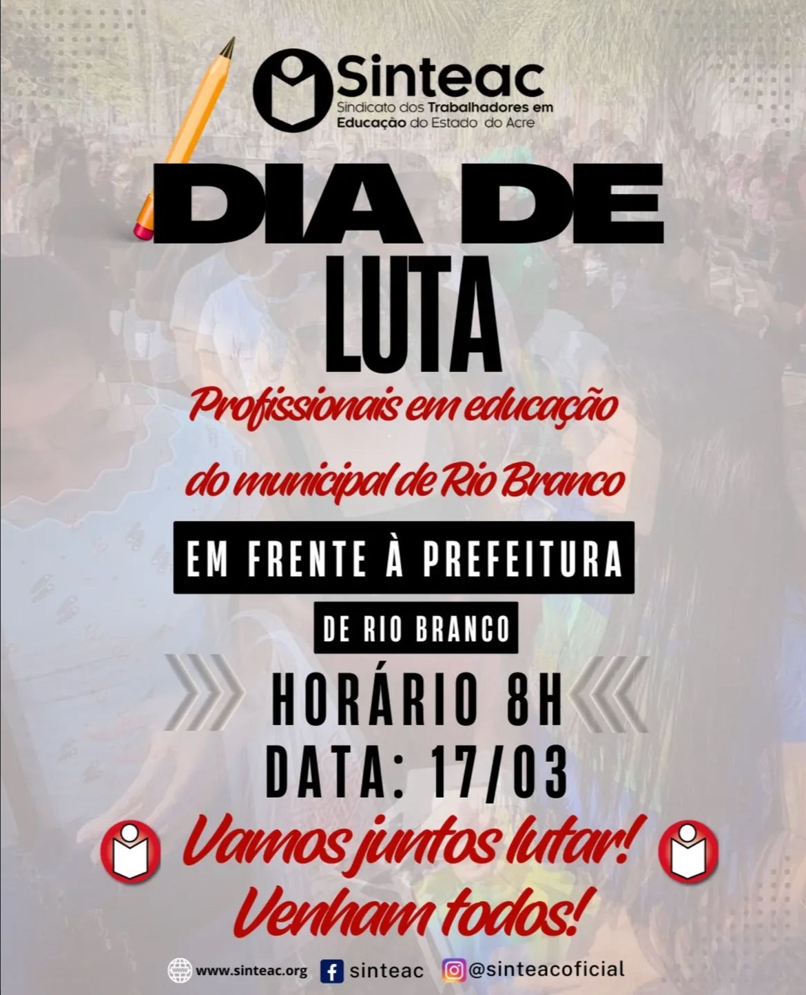 O Sindicato dos Trabalhadores em Educação do Acre (Sinteac) vai realizar, na manhã desta terça-feira (17), a partir das 8h, em frente à Prefeitura de Rio Branco, uma mobilização para cobrar reivindicações que, segundo a entidade, ainda não foram atendidas pela gestão do prefeito Tião Bocalom.